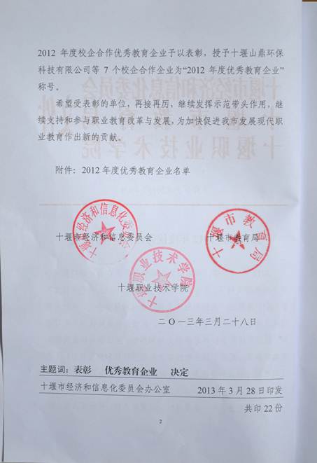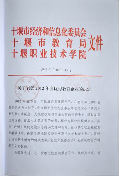 2013年4月3日,我司荣获了由“十堰市经济和信息化委员会”、“十堰市教育局”、“十堰职业技术学院”联合颁发的“2012年度优秀教育企业”的奖牌。至此,天行中国手机网页版已连续3年获此殊荣,今年更是以首名的成绩获得“优秀教育企业”的称号。